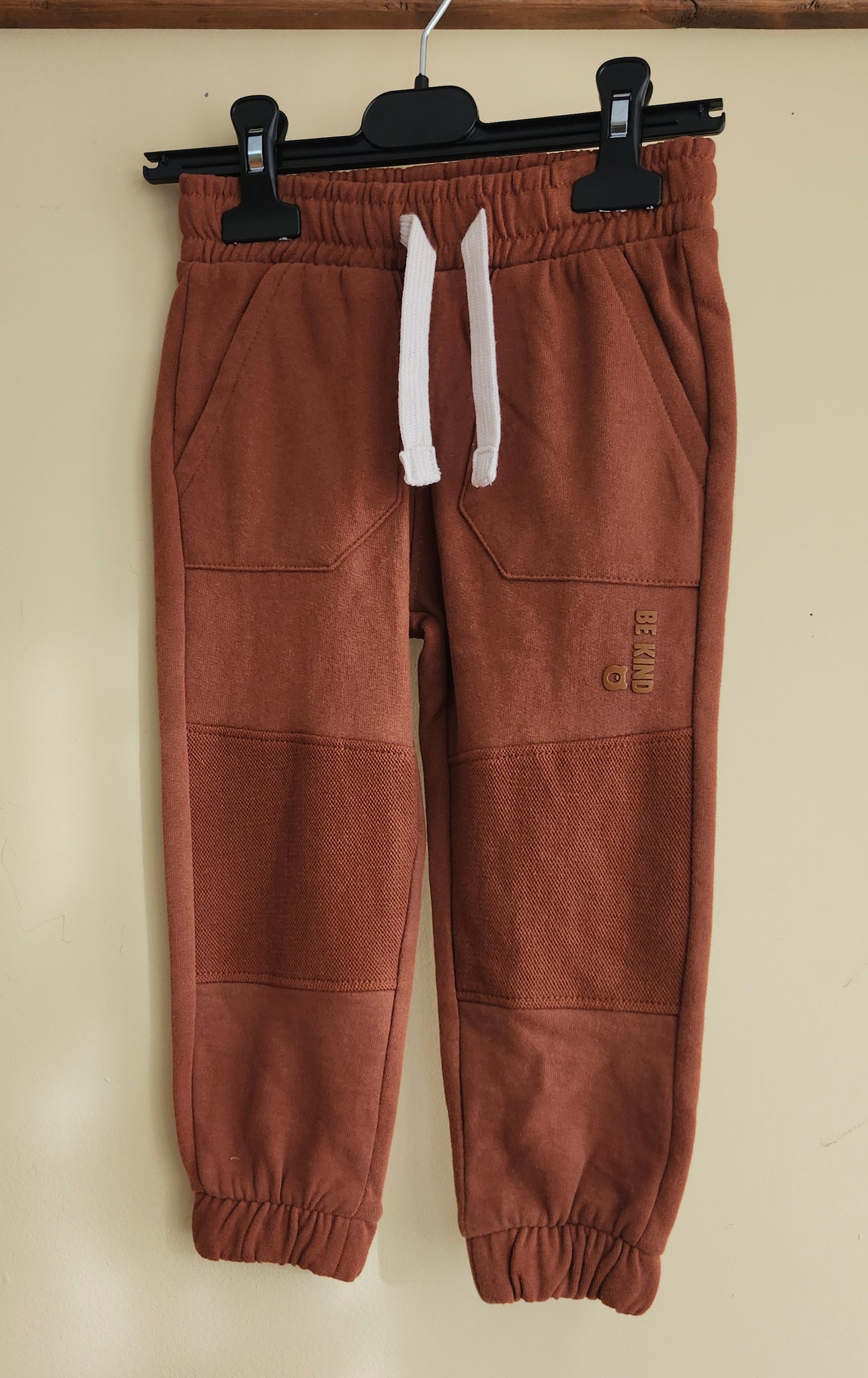 A soft and comfortable cotton jog pant, in a warm rusty bisque colour.  A handsome look with front patch pockets.  Easy on with an elastic waist and adjustable draw string.