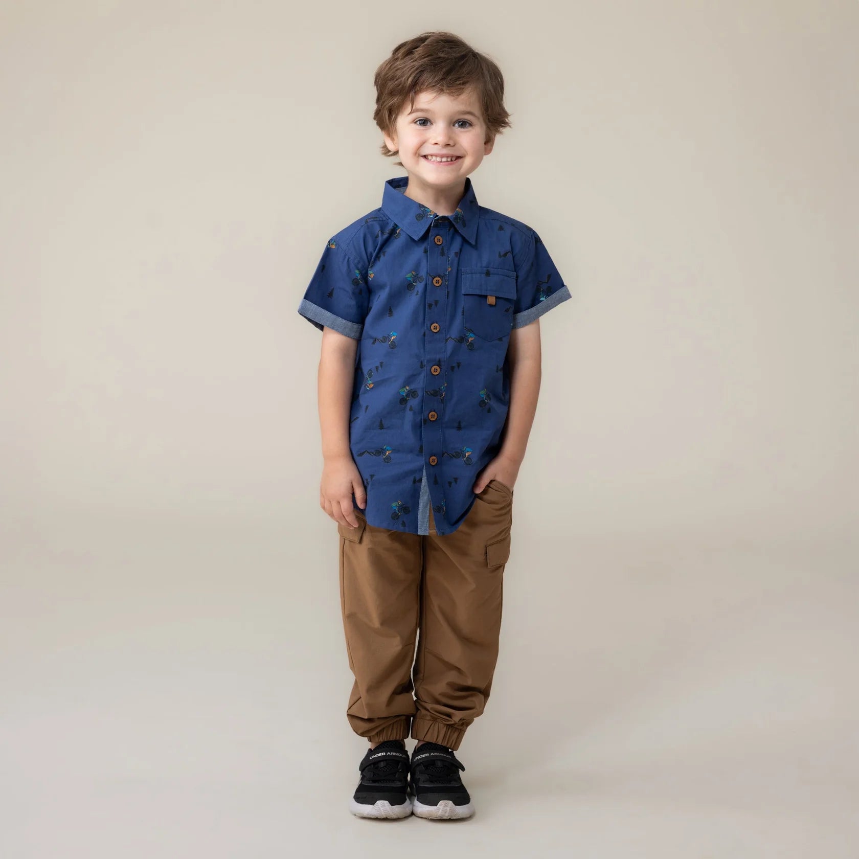 • Printed poplin and chambray shirt• Shirt collar• Short sleeves• Button closure at the front• Patch pockets on the bust