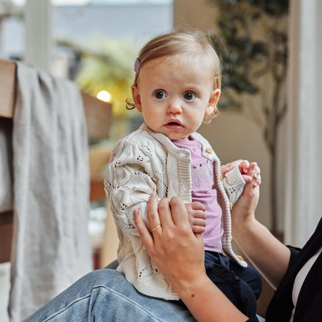 This knitted cardigan by Dirkje in the colour off white will instantly give your little one's winter wardrobe a stylish upgrade! The open knitted pattern and buttons give the cardigan an elegant look, perfect for the season. This girls cardigan is ideal to pair with a pretty dress or long sleeve for a cozy, layering look.